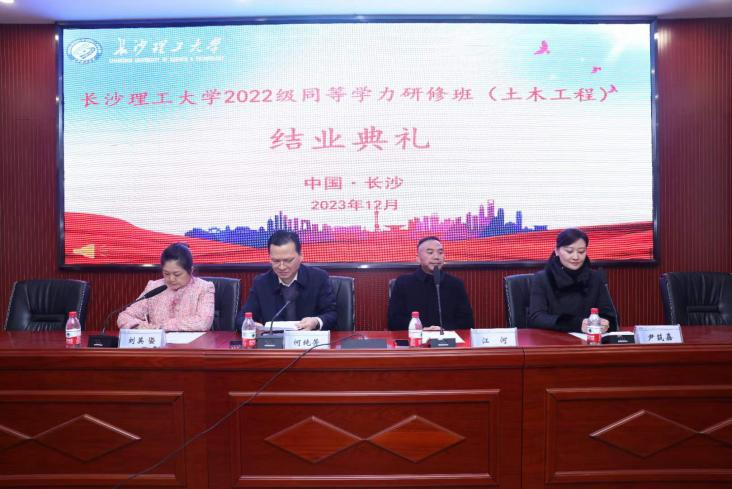 2023年12月17日,william威廉中文官网2022级同等学力(土木工程专业)研修班结业仪式在金盆岭校区隆重举行,土木工程学院党委书记江河,研究生院副院长尹筑嘉,继续教育学院党总支书记何纯芳、副院长刘英姿等领导,出席了结业仪式。