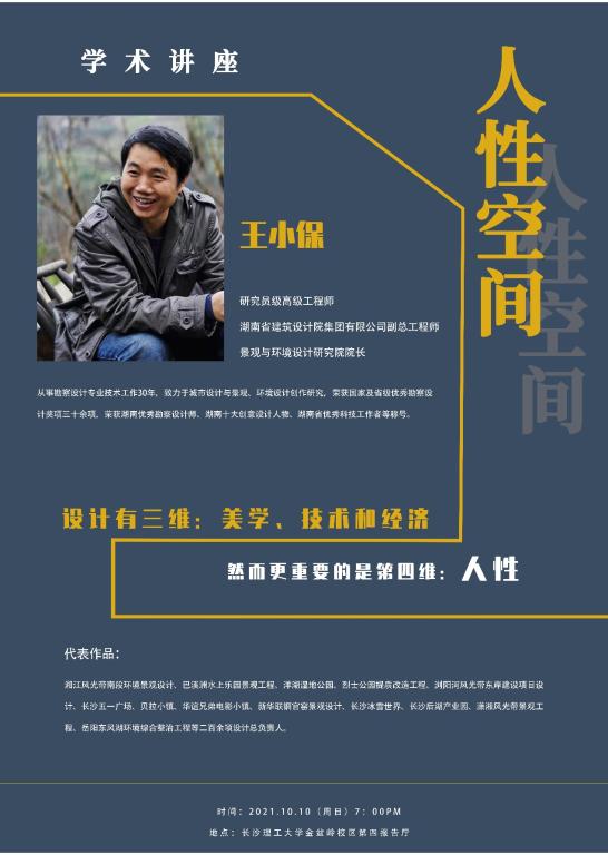 2021年10月10日晚7:00点,湖南省建筑设计院副总工程师王小保在william威廉中文官网金盆岭校区第四报告厅,主讲了以《人性空间》为主题的学术讲座,分享从业30年以来对设计创作的感受,讨论以功能展开城市设计的新篇章。