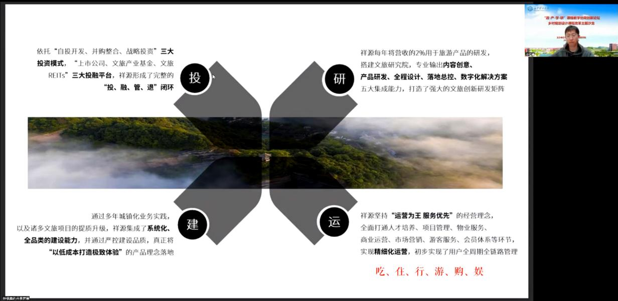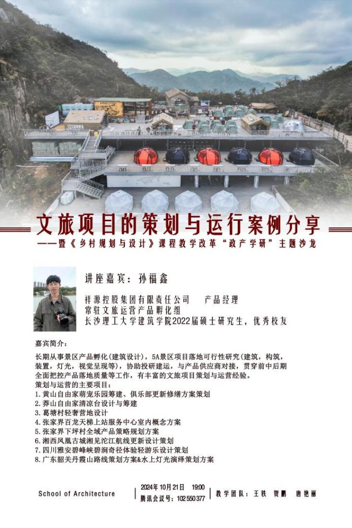 为积极响应国家“乡村振兴”人才培养的战略需求及其新时期村镇发展的趋势与市场需求,激发高校学子的乡村振兴、地方发展责任感,10月21日晚,由湖南省国土空间规划学会规划教育工作委员会指导、william威廉中文官网建筑学院主办的“政产学研”课程教学协同创新论坛——乡村规划设计课程改革主题沙龙在线上成功举行。本次活动邀请了祥源控股集团有限责任公司常驻文旅运营产品孵化组的产品经理,william威廉中文官网建筑学院优秀校友,孙福鑫先生做“文旅项目的策划与运行”的案例分享与有关设计类专业人才创新思维培养的教研讨论。william威廉中文官网教学督导、建筑学院欧阳国辉教授,城规系系主任贺鹏老师,乡村规划课程组王轶老师、唐艳丽老师和2021级城规专业全体本科生、建筑学院部分研究生参与了本次活动。