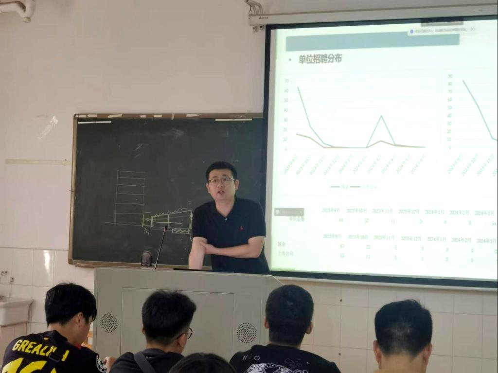 其次,王宇霖为大家详细的介绍了近几年学院的毕业生就业升学概况,包括就业单位去向、升学去向,鼓励大家理性分析、科学规划,强调职业生涯规划的重要性,把握好在校期间的实习机会,抓住秋招、春招等就业黄金期积极投递简历;考研考公的同学,需把握好在学校的时间,力争上岸。