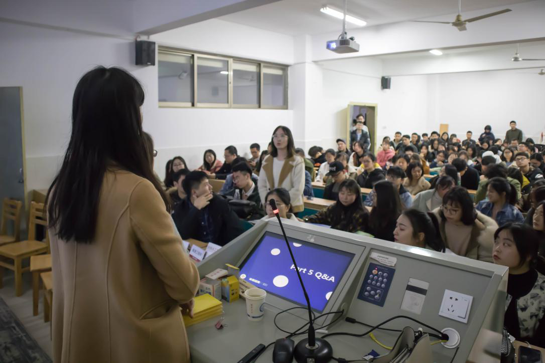 (宣讲人认真的回答学生疑问)