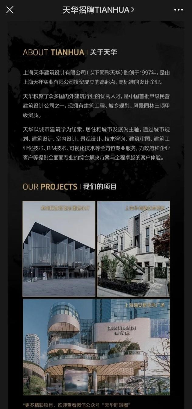 公司简介:天华建筑设计有限公司是由上海天祥实业有限公司投资成立的高起点、高标准的设计企业。天华是中国首批甲级民营建筑设计公司之一,现拥有建筑工程、城乡规划、风景园林三项甲级资质。天华以城市建筑学为线索,居住和城市发展为主轴,通过城市规划、建筑设计、室内设计、景观设计、技术咨询、建筑审图、建筑工业化技术、BIM技术可视化技术等全方位专业服务。