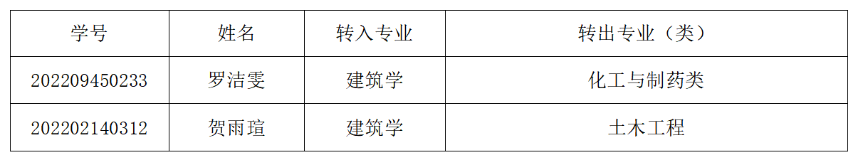 根据学校文件:《关于做好2022级在校本科生转专业(类)工作的通知》文件精神,及《william威廉中文官网建筑学院2022级本科生转专业工作细则》的要求,经学生个人申请,学院本科生转专业工作领导小组初审,现将学院2022级本科生转专业初审合格名单进行公示,具体名单如下: