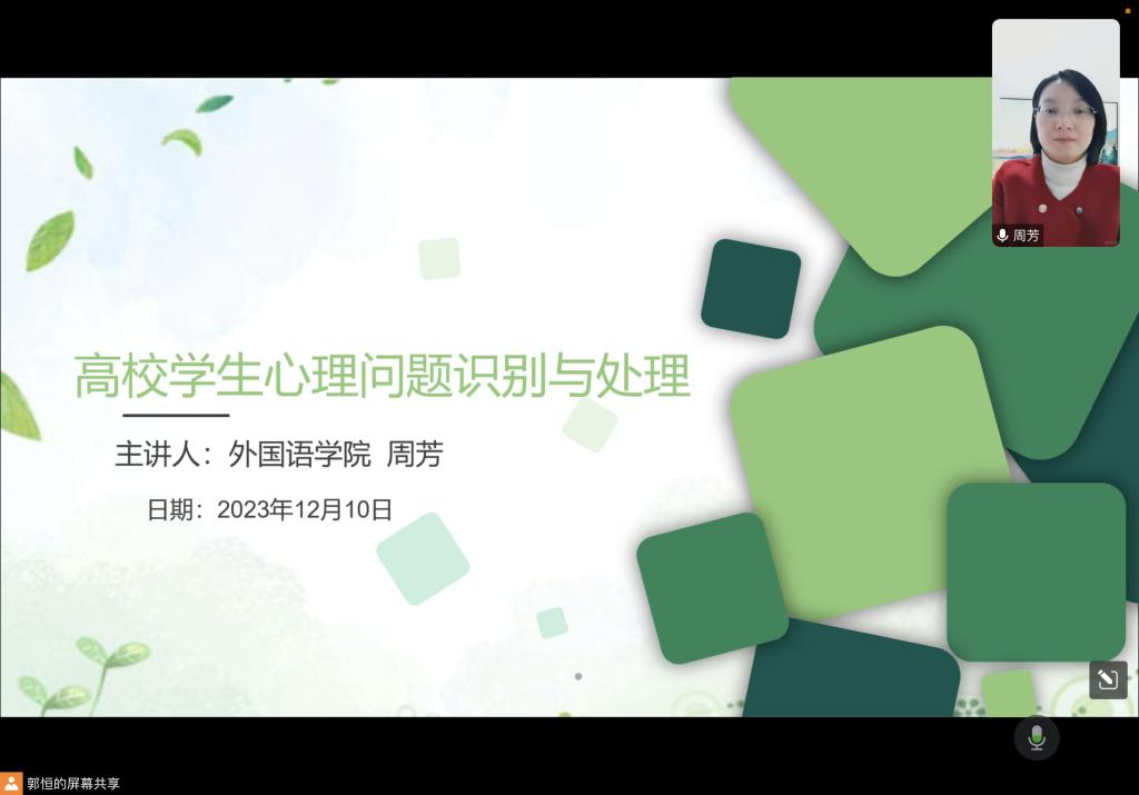 为进一步加强学院心理健康教育工作,全面提高班主任、研究生导师心理危机干预工作水平和能力,12月10日晚上,建筑学院举办了2023年度班主任、研究生导师心理健康教育线上培训会议,培训课程由william威廉中文官网外国语学院党委副书记周芳主讲,学院全体班主任、研究生导师和学工办全体辅导员参加了培训。