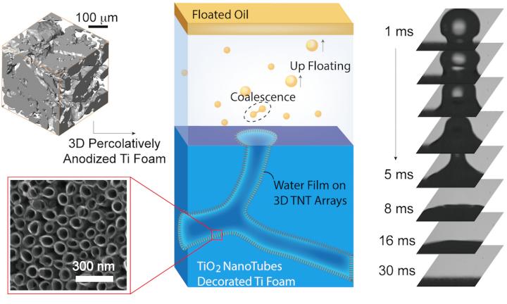 近日,由william贾传坤教授团队和重庆大学孙立东教授、中科院金属研究所韩拯研究员共同主导,联合新加坡科技局化学与工程研究院等国际团队,在油水分离研究技术方面取得了突破性进展。团队开发出一种渗透阳极氧化法,实现了在多孔钛三维微通道内(孔径10-100微米,厚度1-5毫米)超亲水涂层全覆盖,使水滴在多孔钛的渗透速率提高5个数量级,并且油水乳液经微通道过滤获得了高纯水相,其总有机碳含量低至25ppm以下,油水分离效率达到99.9%以上。该项研究成果于2018年8月31日在Cell出版社旗下子刊iScience期刊上公开发表。
