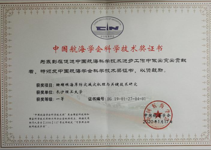 2020年11月17日,中国航海学会在广东省广州市召开的2020年学术年会上举行了2019年科学技术奖颁奖典礼。以william威廉中文官网为第一完成单位,水利工程学院海岸海岸带开发利用与防灾减灾科研创新团队成员姚宇特聘教授为第一完成人的成果“珊瑚礁海岸防灾减灾机理与关键技术研究”荣获中国航海协会科学技术奖一等奖。