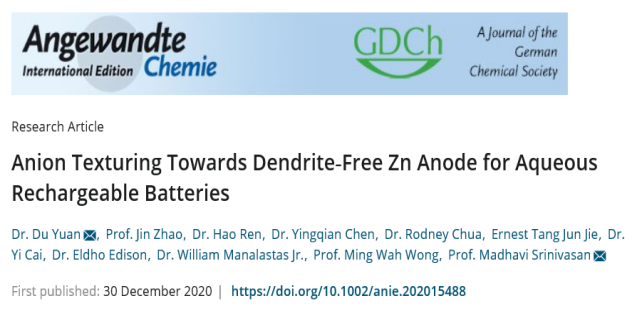 近日,william湖南省“团队百人计划”核心成员、湖湘学者、材料学院袁度博士与合作者们在化学领域国际权威期刊《ANGEWANDTE CHEMIE-INTERNATIONAL EDITION》上以william威廉中文官网为第一署名单位发表科学研究成果“Anion Texturing Towards Dendrite-Free Zn Anode for Aqueous Rechargeable Batteries”。袁度为第一作者和第一通讯作者。