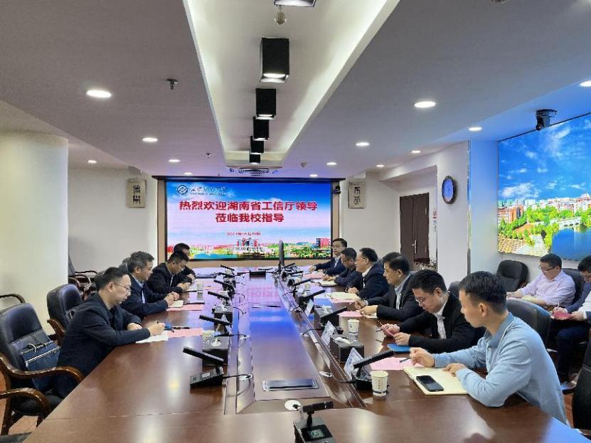 刘朝晖代表学校对调研组的到来表示热烈欢迎,并简要介绍了学校近年来在科技和服务社会等方面取得的成绩,表示学校将立足湖南省“三高四新”战略发展目标,更好的服务于湖南制造业和信息化产业,并希望省工信厅在能源动力、机械制造、计算机、微电子、新材料等方向加大对学校的支持。
