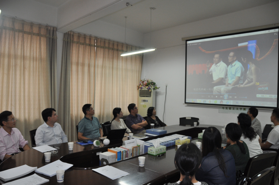 2017年10月10日下午,马克思主义学院教师在云塘校区集中观看了我院蓝茵茵博士参与的理论谈话节目《社会主义“有点潮”》第一集——“乌托邦是个什么岛?”。湖南教育电视台现场采访了同学们的观影感想,并在“教视新闻”中播出。院党委书记易显飞、院长陈万球等领导与老师们一同观看了该节目。