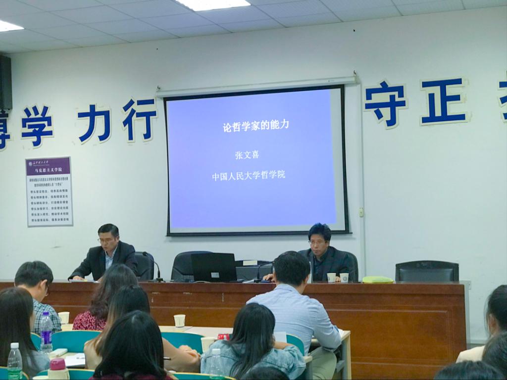 2018年10月12日下午14点,中国人民大学哲学院博士生导师、张文喜教授,应邀在william云塘校区文科楼C202报告厅进行了题为“论哲学家的能力”的学术讲座。william马克思主义学院陈万球院长、张明海副院长、部分教师和全体研究生聆听了此次讲座。讲座由马克思主义学院院长陈万球教授主持。
