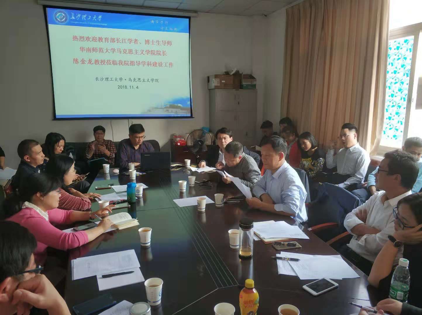 陈万球院长首先对我院的历史与现状、学科建设与科研工作进行了简要介绍。陈金龙教授对我院近年来取得的进步表示赞赏,对我院在科研项目上所取得的良好成绩给予了充分肯定。随后,陈教授就马克思主义理论一级学科建设的学科方向、团队建设、科研成果、人才培养等方面分享了华南师范大学的经验,并对我院马克思主义理论学科的发展方向提出了一些建议。最后,陈教授还与我院教师分享了他在科研论文的选题、撰写、投稿等方面与科研项目申报方面的一些经验与技巧。