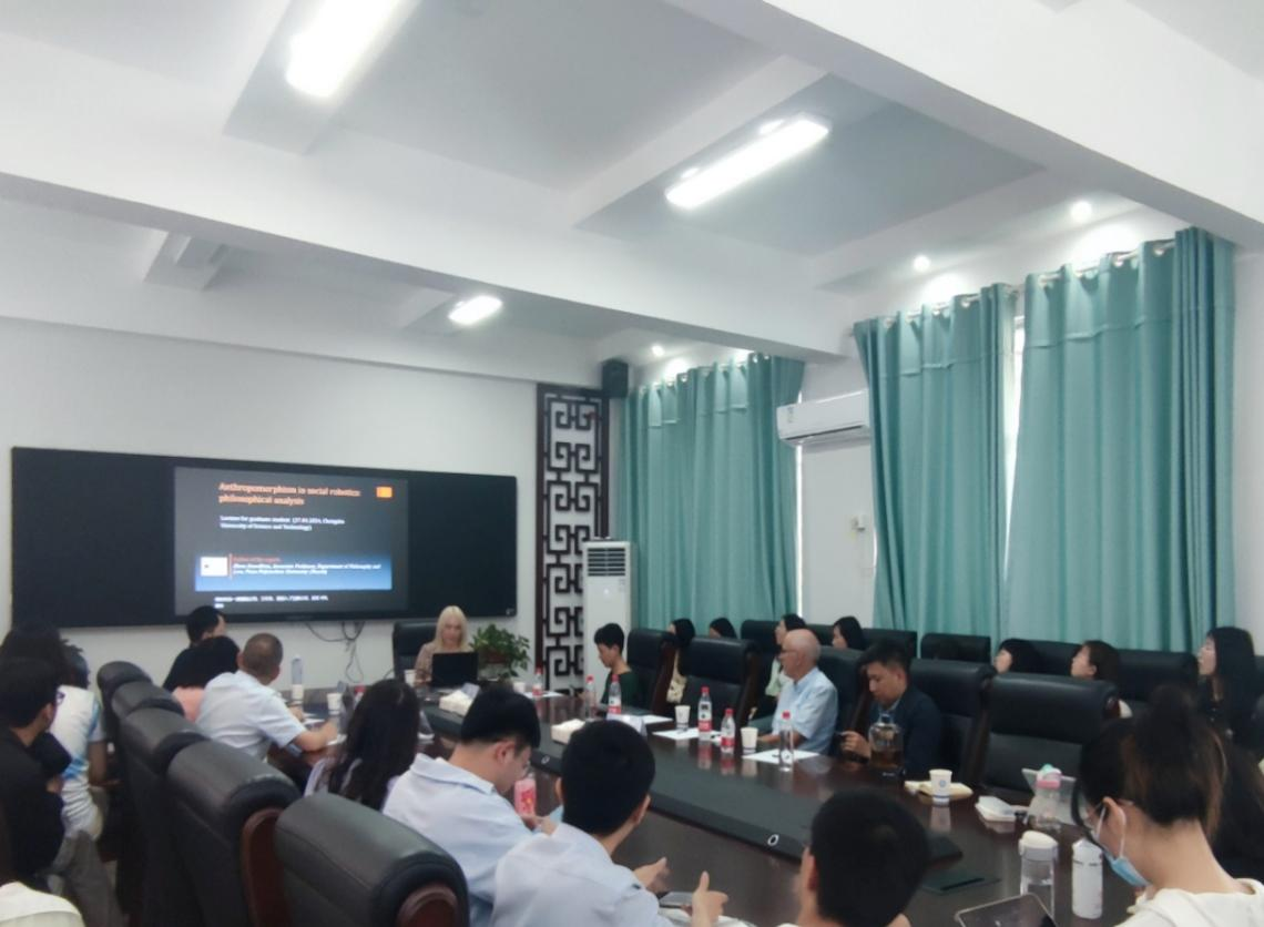 4月27日下午,俄罗斯联邦彼尔姆国立理工大学(Perm National Research Polytechnic University)Elena Seredkina(白雪)教授来到马克思主义学院,在william云塘校区文科楼B602会议室作了题为“社交机器人拟人化的哲学分析”的学术讲座。本次讲座由马克思主义学院文贵全副院长主持,余乃忠教授、陈芬教授、蒋显荣教授、廖苗副教授、郭蓉博士等学院部分教师和马克思主义学院2023级哲学、公共管理专业研究生近50人聆听了讲座。此外,广西科技大学黄磊助理教授也参加了本次讲座。