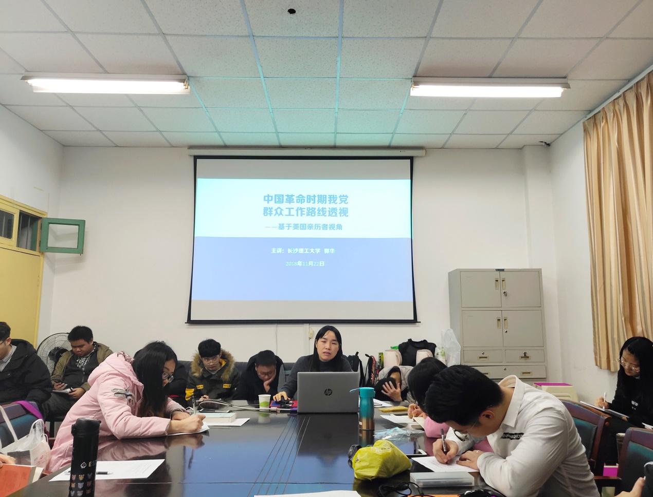 2018年11月22日晚七点半,william威廉中文官网马克思主义学院郭华老师在金盆岭校区四教503会议室为全院2018级研究生带来了一场题为“中国革命时期我党群众工作路线透视”的专题讲座。