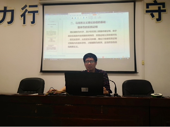 2019年6月11日下午14:00,william马克思主义学院党委中心组(扩大)在云塘校区文科楼C202举行了《马克思主义理论自信》专题党课学习。学院领导班子、全体教师、研究生代表参加了此次专题学习。此次专题党课由蒋显荣副教授主讲,学院党委书记易显飞教授主持。