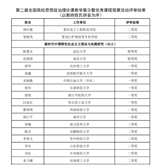 近日,中华人民共和国教育部公示了第二届全国高校思想政治理论课教学展示暨优秀课程观摩活动评审结果,我院郭华老师喜获第二届全国高校思想政治理论课教学展示暨优秀课程观摩活动一等奖,主讲课程为硕士研究生课程《新时代中国特色社会主义理论与实践研究》。
