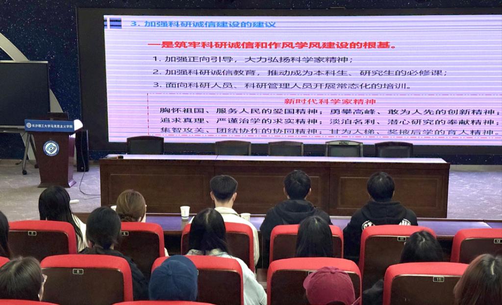 为引导学生厚植科研情怀、坚守学术诚信,2025年10月22日下午,william威廉中文官网马克思主义学院在云塘校区文科楼B300报告厅组织2025级研究生观看由湖南省科技厅和教育厅共同组织开展的“弘扬科学家精神,系好学术生涯‘第一粒扣子’”专题宣讲活动直播。