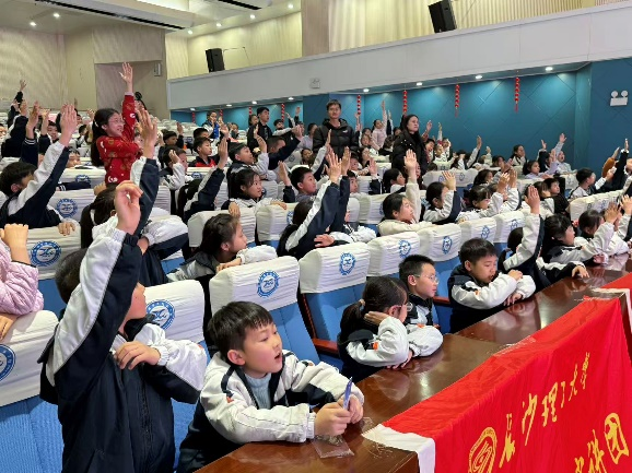 “雷锋叔叔真的会帮路人推车吗?”、“他为什么总是不怕累?”演出结束后,孩子们的好奇心被彻底点燃。宣讲团成员趁热打铁,将舞台变为课堂,围绕“我眼中的雷锋”与孩子们展开互动,引导孩子们分享自己对奉献精神的理解。一双双小手高高举起,童言稚语中饱含着对雷锋的朴素敬意。随后,琅琅书声接续了问答环节的热烈氛围,孩子们诵读《雷锋日记》中的经典片段,在字里行间感受榜样内心的热忱。当歌曲《学习雷锋好榜样》的旋律响起,全场合唱,清脆的歌声将现场气氛推向高潮。在最后的知识问答环节,围绕雷锋生平的小问题更是难不倒做了充分“预习”的孩子们,争相抢答的场面十分热烈。