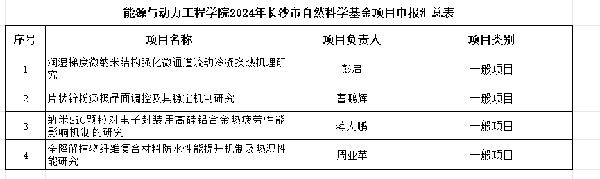 根据william威廉中文官网科学技术处《关于组织开展2024年度长沙市自然科学基金项目申报工作的通知》文件精神,经学院教授委员会专家评审,拟推荐“润湿梯度微纳米结构强化微通道流动冷凝换热机理研究”等4项项目申报2024年度长沙市自然科学基金项目,具体名单如下: