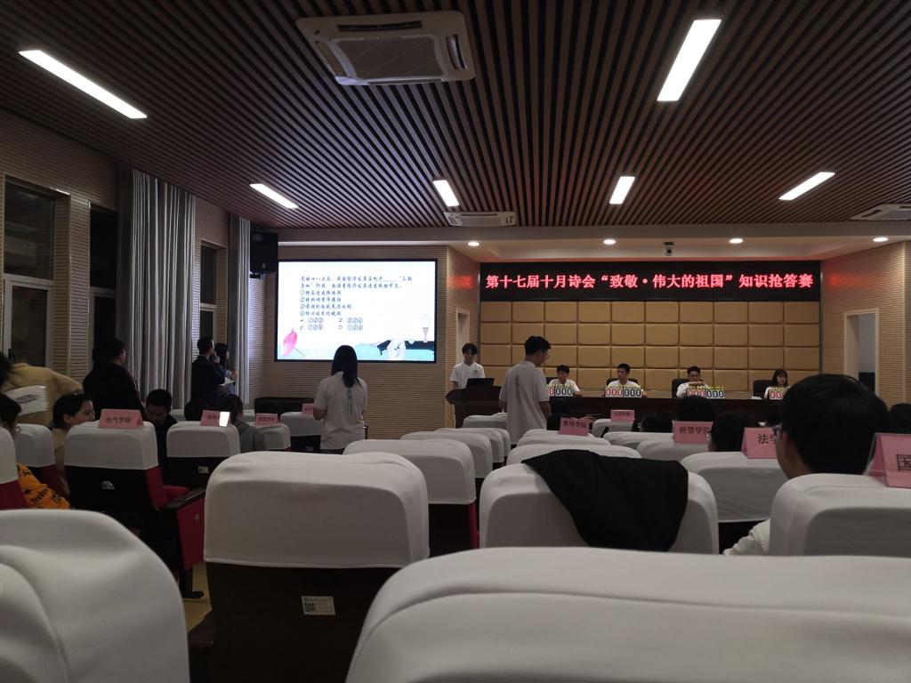 为了提高大学生的综合素质,增强大学生对祖国和学校的了解和热爱,2020年10月20日晚7点,第十七届十月诗会“致敬·伟大祖国”知识抢答大赛复赛在云塘校区理科楼A200隆重举行。