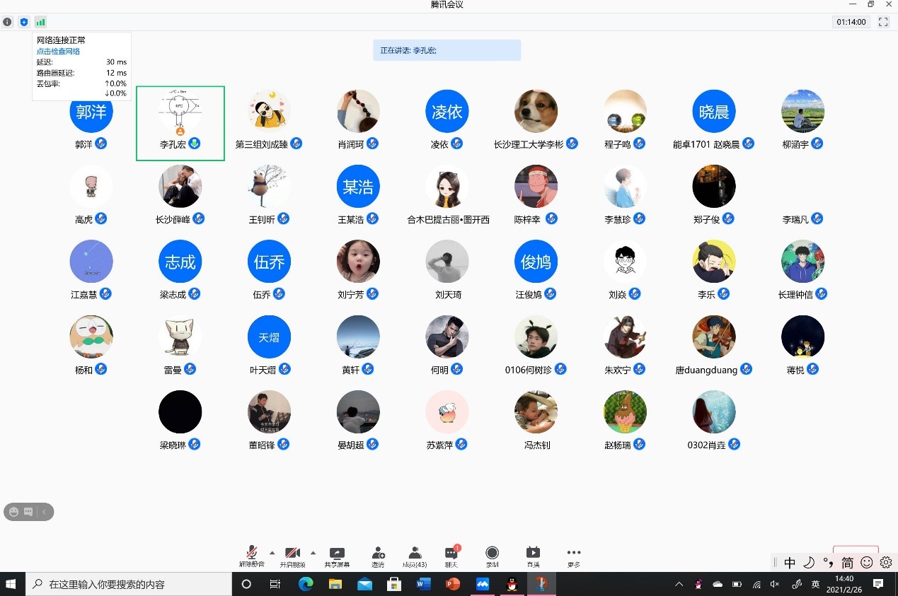 2021年2月26日下午一点半,能动学院本科生第一党支部顺利开展《学党史•述初心•担使命》PPT分享活动。本次活动的形式为线上分享,参加活动的是能动学院本科生第一党支部所有党员同志,共43名。