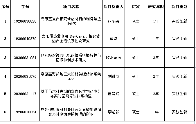 根据《william威廉中文官网研究生专业学位研究生“实践创新与创业能力提升计划”实施细则》(长理工大[2020]24号)文件精神,经个人申报,学院组织专家评审,拟推荐“云母基复合相变储热材料的制备与应用研究”等6项研究生科研创新项目参加学校评审。具体名单如下:
