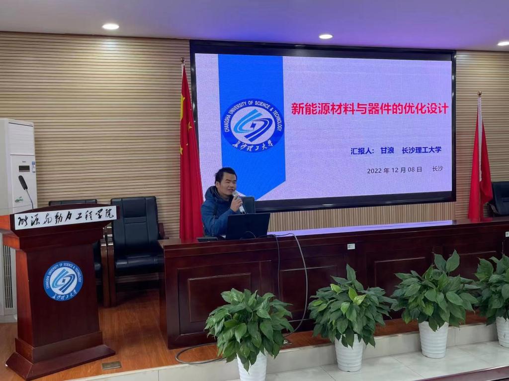 甘浪的报告内容是《新型能源材料与器件的优化设计》。他以锌空气电池研究背景为切入点,指出二次锌-空气电池的关键问题在于缺乏高效双功能电催化剂。随后以聚合物电解质膜燃料电池(PEMFC)为例介绍燃料电池,他强调发展燃料电池技术有助于完善湖南省新能源布局,并对能源、环境问题具有重要战略意义。