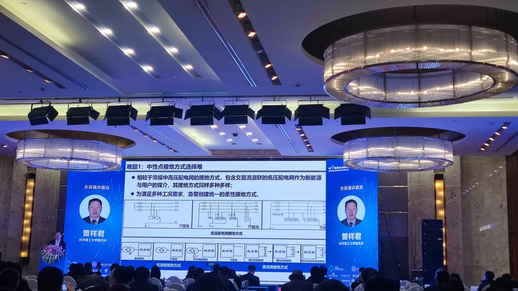中国工程院院士罗安致开幕辞,湖南省能源局副局长陈劲山、国家应对气候变化战略研究和国际合作中心首任主任分别发表主旨演讲,中国工程院院士/中国中车首席科学家丁荣军做了“双碳背景下我国新能源产业发展的技术路径与趋势”的大会报告,曾祥君副校长做了“新能源发电系统中性点经变压器新型接地方式”的学术报告。
