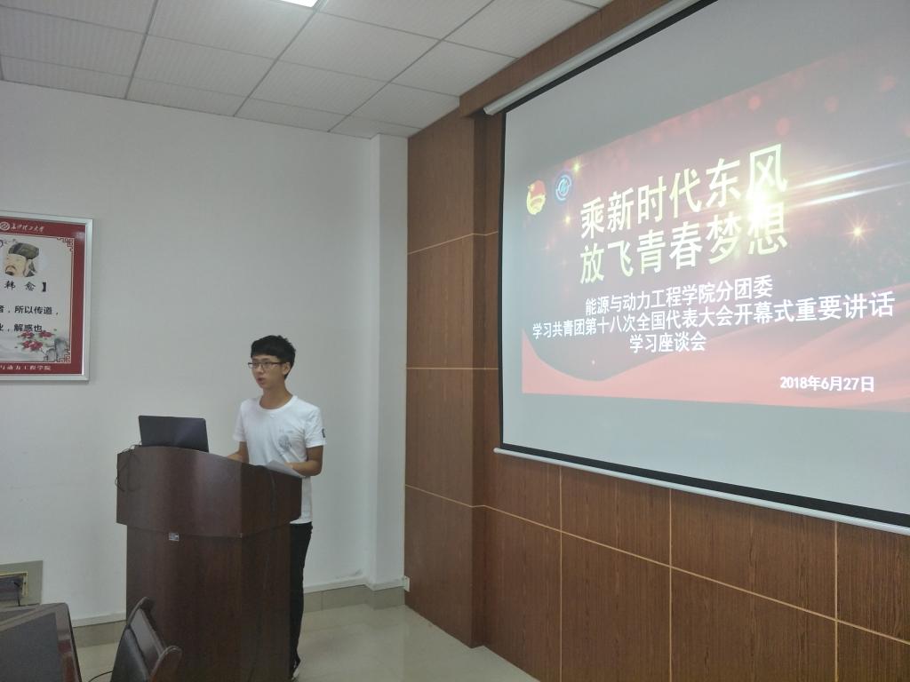 6月27日中午,能源与动力工程学院分团委于工一A422组织部分团学干部观看了共青团第十八次全国代表大会开幕式,学习王沪宁同志以“乘新时代东风,放飞青春梦想”为主题的重要讲话,座谈会由第十五届分团委组织部叶天熠主持。