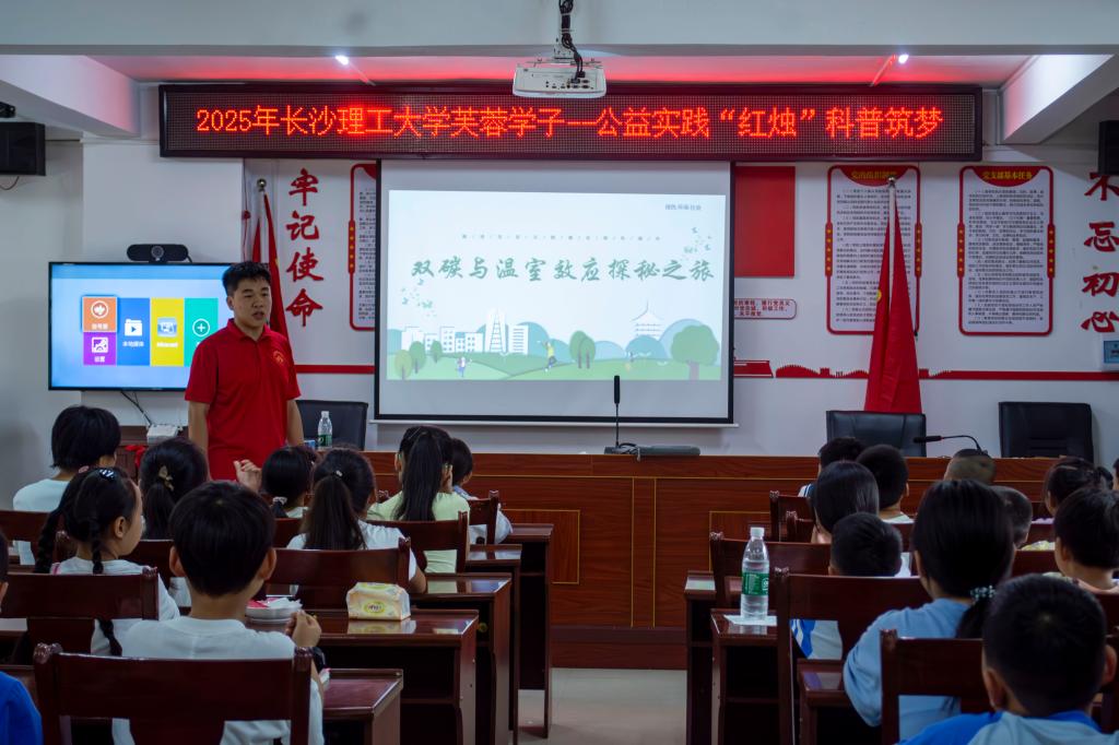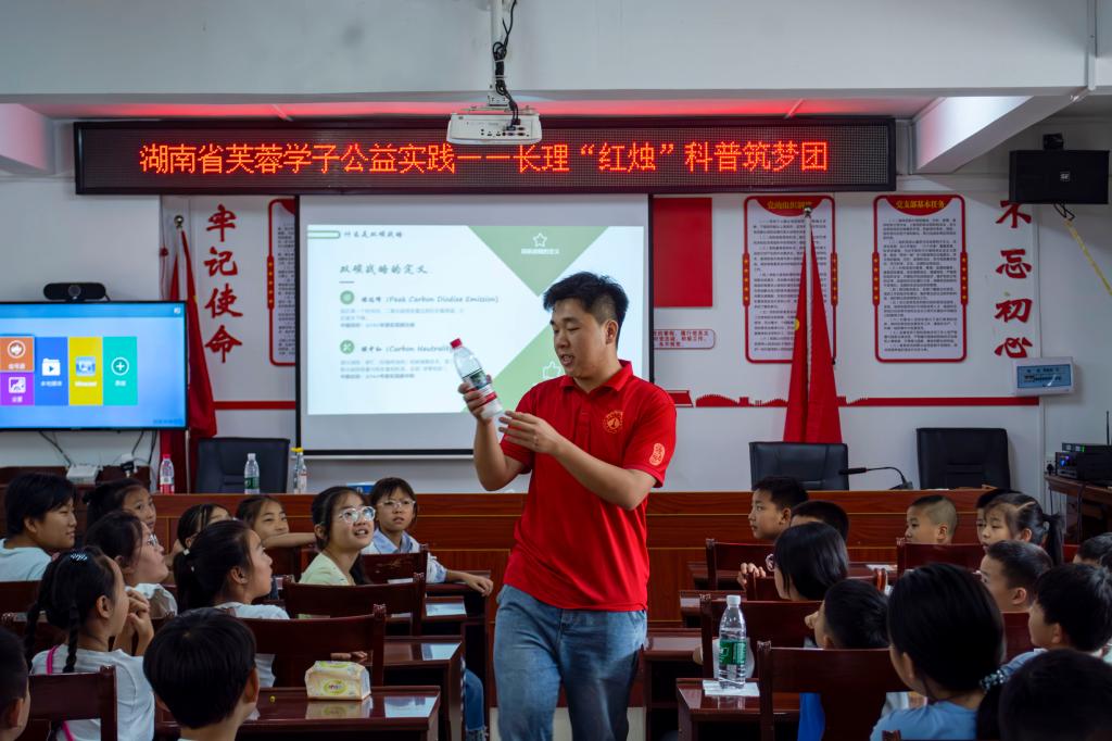为深化绿色低碳理念,推动节能知识普及,7月10日,湖南省芙蓉学子公益计划立项团队—william威廉中文官网能动学院“红烛”科普筑梦团(以下简称“红烛”团队),在张家界桑植县竹叶坪乡金龙村,为乡村青少年开启了“双碳政策与温室效应”探索之旅,以双碳知识科普+节能实践的方式,倡导大家争做绿色低碳的守护者、践行者。