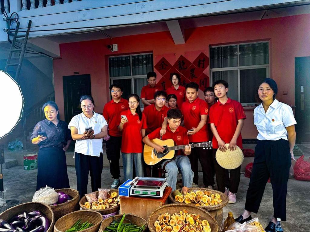 7月11日傍晚,直播正式开启,面对镜头下略显紧张的氛围,队员刘嘉雨缓缓拨动琴弦,悠扬的旋律流淌出来,全体大合唱瞬间抓住了屏幕前观众的耳朵。“暖场”过后,志愿者们化身“金牌助播”,免费为村民推广应季瓜果蔬菜、土特产等,配合介绍产品特点,灵活切换产品展示角度,用笑容和互动点燃评论区热情,既宣传了乡村生活,又实现了“网上赶集”——让城里人“逛农村菜摊子”,解决“城里吃不到,农村吃不完”的供需矛盾。“听听这声音,多新鲜!刚从地里摘的!茄子有清热解暑的作用,好吃还不贵。有需要的朋友赶紧下单哦!” 又或是双手捧起一把红艳艳的辣椒,凑近镜头,让观看直播的“潜在客户”仿佛能闻到那股特有的辛香。小小的手机屏幕里,订单提示音此起彼伏地响起,首场直播达到2400+观看人数,点赞量达10W+,汗水和笑容交织在每一张年轻的脸上——这是“云端”助农初战告捷的生动注脚!