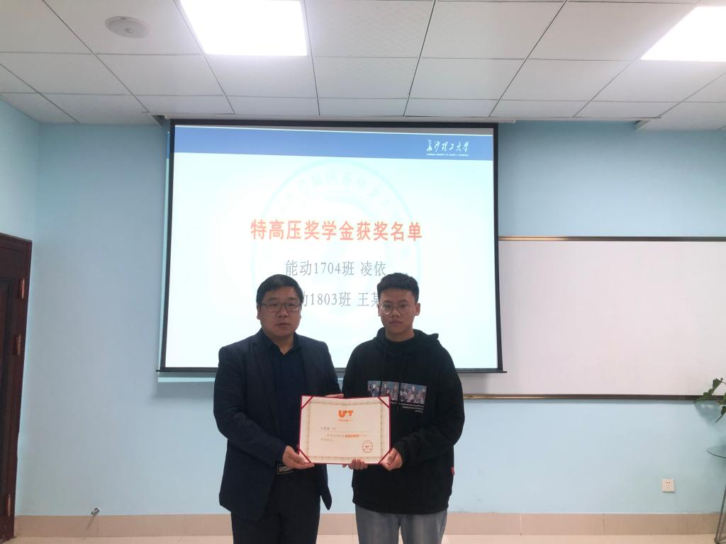 靳攀科向获奖同学表示祝贺,希望能动学子以“特高压电网奖学金”评选为契机,了解我国电力行业的发展历程及前进方向,在追求长理梦、电力梦、中国梦的征程中书写新的壮丽篇章。同时,靳攀科勉励同学们继续在电力领域深入学习为国家电力行业发展作出更大贡献。随后,靳攀科为获奖的两位同学颁发了获奖证书并合影留念。他表示,长期以来国家电网公司等电力行业企业为国家经济建设和社会发展作出了突出贡献。特高压电网奖学金作为全国首个能源行业奖学基金,是电力行业发挥自身优势支持教育事业的实际行动,是促进行业协同、校企合作的积极作为,能动学院将继续积极发挥学科和人才优势,努力为电力行业的发展贡献力量!