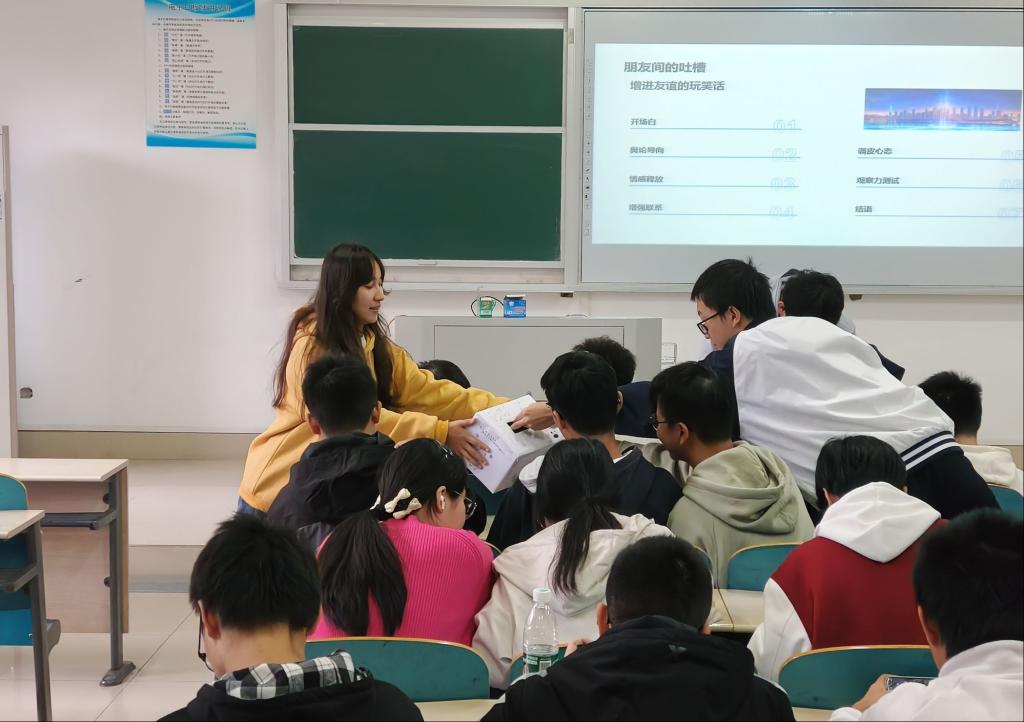 班会包括“心灵树洞”和“吐槽大会”环节。各班心理委员通过PPT展示大学中需要适应的多元角色,引领同学们回忆高中生活,深入察觉大学以来变化和内心感受,巧妙引出心灵树洞环节。在这一环节,各班心理委员鼓励同学们在纸片上写下内心最想对自己说的一段话并将纸片投入树洞,以此寄托自己的情感。随后是“吐槽大会”环节,同学们踊跃登台,畅所欲言,将生活中的糗事、内心的郁闷一吐为快。借此帮助同学们克服心理障碍,排解同学们的烦恼与焦虑,以更健康更积极的心态面对学习和生活。