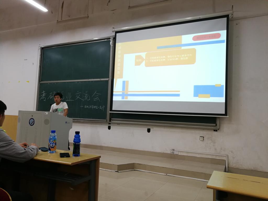 活动伊始,申修伟说大家一定要向优秀的人学习,认真听取学长学姐的经验分享,找准自己的定位,规划好自己的大学生活。随后,七名学生代表依次上台进行经验分享。首先,由考研代表林恩承、张磊、李琴同学分别分享自己在考研过程中的经验与心得。林恩承考取了上海交通大学的研究生,他给大家介绍了一般的考研学习进度安排和在复习过程中需要重点注意的细节,并强调我们要注重方法,善于总结。张磊同学以自己的切身经历向大家讲述了考研各科的复习方法。李琴同学则认为我们在考研过程中心态很重要,不能被一些外界因素影响了备考心情,从而影响复习进度。随后,保研代表赵祥乐就保研的具体条件和加分项以及保研面试的内容向大家进行了详细的介绍,他强调大家在保证优秀的学科成绩的条件下一定要积极参加科研项目,为以后保研打下坚实的基础。最后,就业代表申修伟、李添舒以及文金花同学以幽默通俗的讲话向大家介绍了自己的求职经历,他们认为我们应该明确就业方向,通过多种渠道去了解就业信息,特别要注重简历的制作。同学们积极进行互动,整个活动过程气氛和谐,活动效果良好。