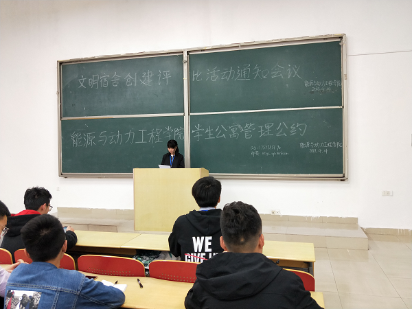 5月8日晚19:00,能动学院班长会议在工一a208召开,能动学院各班班长及分团委学生会生活权益部参加了此次会议。生活权益部部长易萍公布了《能源与动力工程学院学生公寓管理公约》,发起文明寝室倡议活动。