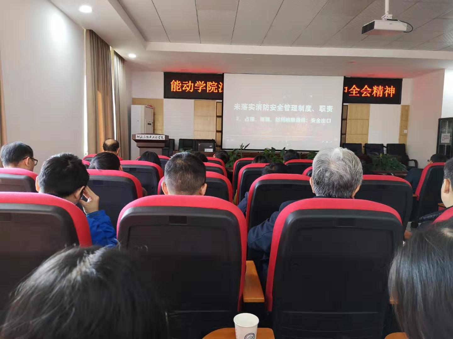 为深入贯彻落实《中华人民共和国消防法》、《消防安全责任制实施办法》,进一步提高学院师生的消防安全意识,杜绝安全隐患,确保学院教学科研工作的顺利进行,11月19日下午,能源与动力工程学院在新能源大楼2号栋504室开展学院教职工消防安全教育,陈冬林书记主持。