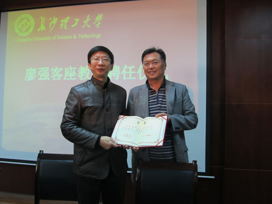 随后,学校纪委书记谈传生教授代表学校向廖强教授颁发了客座教授聘书。谈书记代表学校对廖强教授的到来表示热烈欢迎,他希望能动学院加强与廖强教授的联系,在廖强教授的指导和帮助下,在专业建设、人才培养、学科建设、科学研究与学术交流等方面取得新的进展。