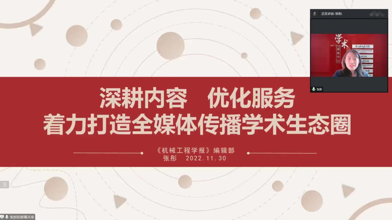 《机械工程学报》编辑部主任张彤以《深耕内容、优化服务,着力打造全媒体传播学术生态圈》为题做了报告,从期刊简介方面详介绍了学术媒体期刊群主要有《机械工程学报》编辑部、《AMF》编辑部、《电气工程学报》编辑部、《中国表面工程学报》编辑部。其次通过近几年的专题出版,指出在专题出版过程中应保持严谨、严肃、求真的态度。最后引入期刊论文的传播与服务过程介绍了目前全媒体传播完成了“纸媒+数字+活动+服务+传播”的融合发展的新业态。