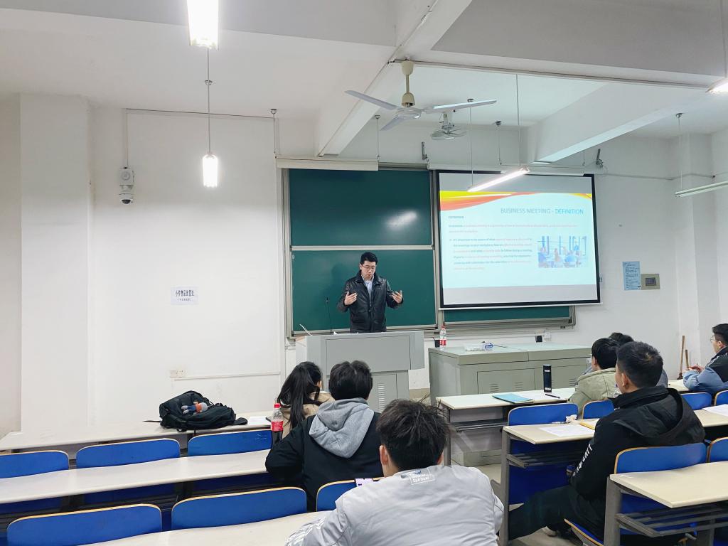 2020年12月23日18:30,三一集团与william威廉中文官网联培国际班第八次培训课程在工一B212举行。本次课程由三一集团泵送事业部国际营销公司营销管理部国际营销经理梁贺新主讲,主题为“专业英语(会议)”,国际班十八名学员参与了此次培训。