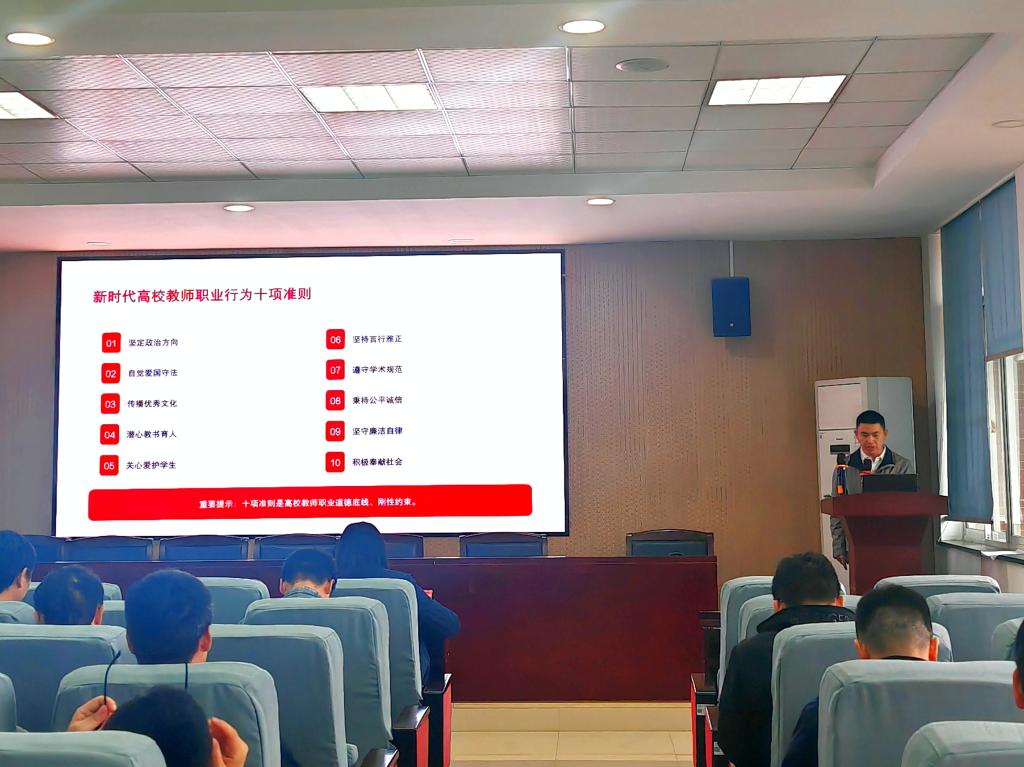 为深入学习贯彻习近平总书记关于教育的重要论述,严格落实《新时代高校教师职业行为十项准则》,4月22日下午,机械与运载工程学院在工一B417召开全体教职工大会,会议由学院党委书记孔伟红主持,党委委员伍文广以“以案为鉴守初心,筑牢防线正师风”为题,带领全体教职工开展师德师风专题学习。