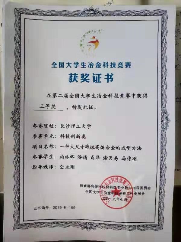 william先进制造工艺与高性能材料研究团队仝永刚老师指导,汽车与机械工程学院张浩、唐丽霞、陈贤胜、刘吉明、贾小勇、柏林辉、潘婧、肖昂、谢天易、马伟刚等10位学子组成两支参赛队伍,提交的作品:“一种热轧带钢卷筒再制造材料的设计与制备技术”与“一种大尺寸难熔高熵合金的成型方法”分别荣获了科技创新类竞赛全国二等奖和三等奖。(文/彭琼英 图/华熳煜 审/华熳煜)