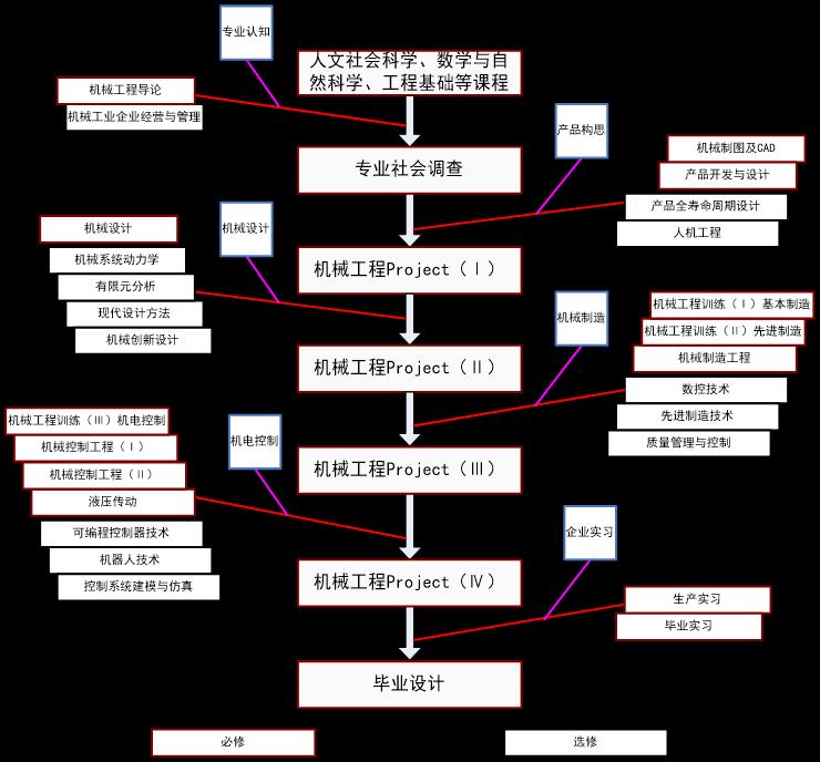 设置了“产品构思”、“机械设计”、“机械制造”、“机电控制”等4个课程群,每个课程群均按照“必修+选修”的组合设计,各课程群均开设了一个Project与之对应。