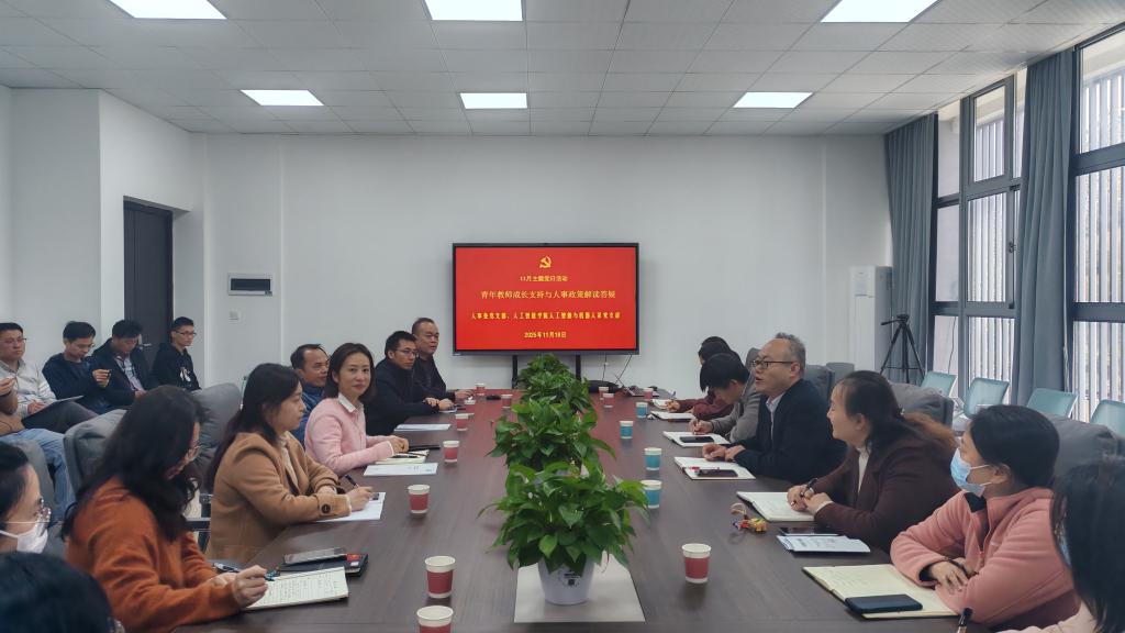 11月18日下午,人事处党支部与人工智能学院人工智能与机器人系党支部在人工智能学院B203会议室联合举办主题党日活动,本次活动以青年教师成长支持与人事政策解读答疑为主题,通过支部联动、政策宣讲与互动交流,深化党建引领与服务教师成长发展相融合。活动由人工智能学院党委书记万馨主持,两个支部党员40余人参加。