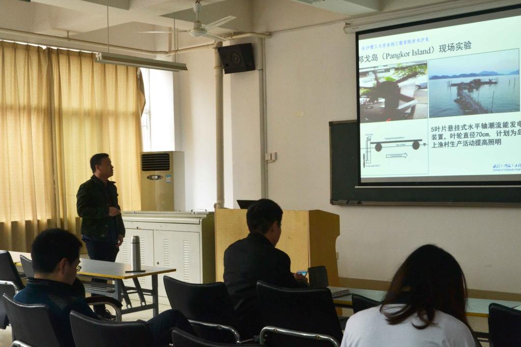 3月14日下午,水利学院“学术沙龙”活动2018年第1期在william云塘校区工三B319举行。我院青年教师陈龙博士作题为“潮流能水轮机尾流特性和冲刷研究”的学术报告,本次报告由我院副研究员李志威主持,我院副教授姚宇以及相关专业的师生参加了本次学术报告。