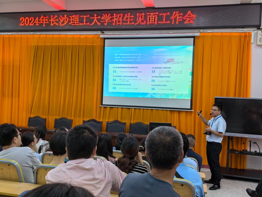 水利学院高度重视招生工作,召开招生宣传工作会议,统筹布局、分析形势、聚焦任务、压实责任,发动专业教师和辅导员积极参与。在招生宣传前进行系统培训,帮助老师们全面了解院校概况和招考政策。老师们主动参加各省市的高招咨询会、深入各地中学开展招生宣传,介绍校院情况,回答考生疑问,充分展现了长理教师的良好风貌。副院长邓斌前往石门一中开展专场招生见面会,以《逐梦长理》为主题,系统介绍了学校学院的发展历程、学科专业、师资力量等基本情况,解读了2024年招生计划和招生政策,吸引了近200名考生及家长参加。