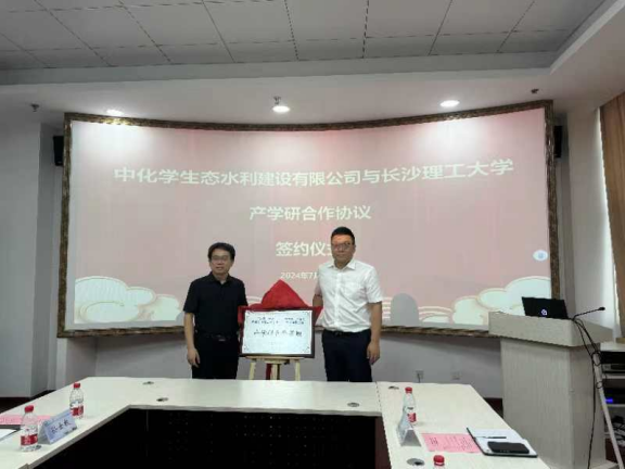 会上,学院院长陈杰和中化学生态水利建设有限公司总工兼副董事长廖文斌代表校企双方签署了产学研合作协议,钱国平副校长和王刚董事长共同为产学研合作基地揭牌。