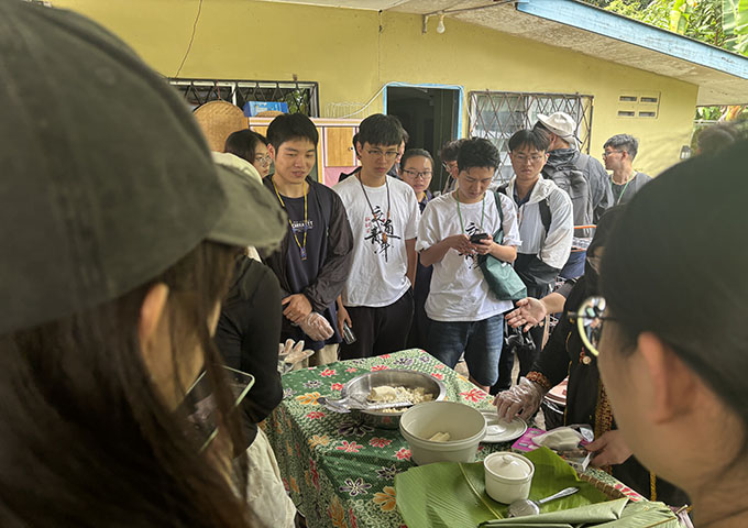 研学团成员近日深入体验了马来西亚独特的文化魅力,详细了解了马来西亚的风土人情,在当地村庄体验了香蕉叶饭、“沙爹”等美食的制作。专硕2402班鲁溢湘同学感叹道,“他们用香蕉叶包裹食物的传统方式,既环保又充满智慧,这让我思考如何将这种可持续理念融入未来的水利工程设计中。”