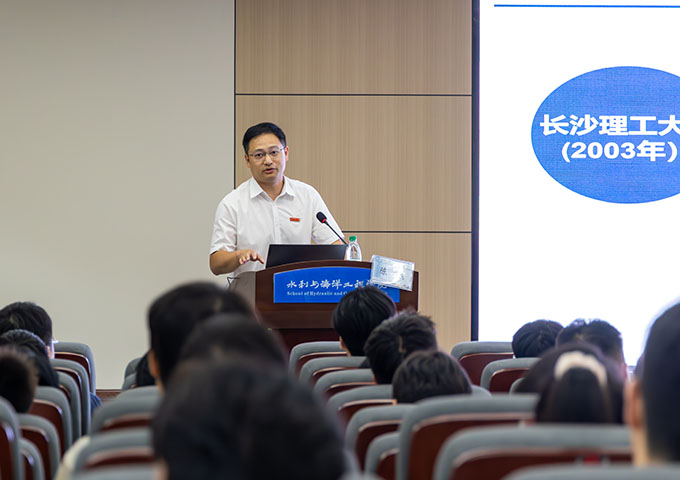 陈杰以“在艰辛而幸福的求学路上活出自己的精彩”为主题,回顾了学院自1956年以来的发展历程,重点介绍了在学科、专业、平台、政策等方面的发展情况。他指出学院已构建完整的“本科-硕士-博士-博士后”人才培养体系,拥有湖南唯一“水利工程”一级博士点、湖南首个“土木水利”专业博士点、“水利工程”博士后工作站,以及“海洋工程”专业博士二级点、“市政工程”二级博士点。