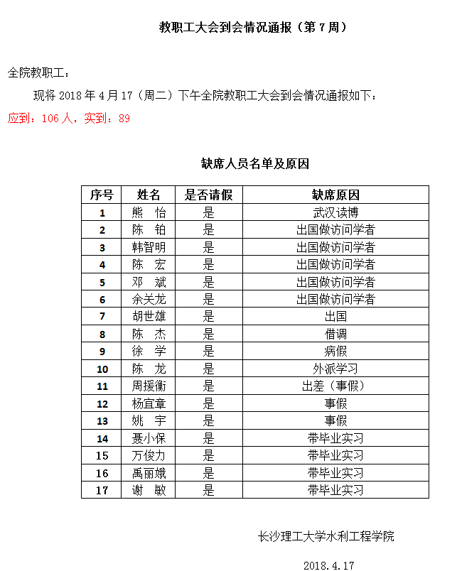 教职工大会到会情况通报(2017-2018学年第二学期第7周)