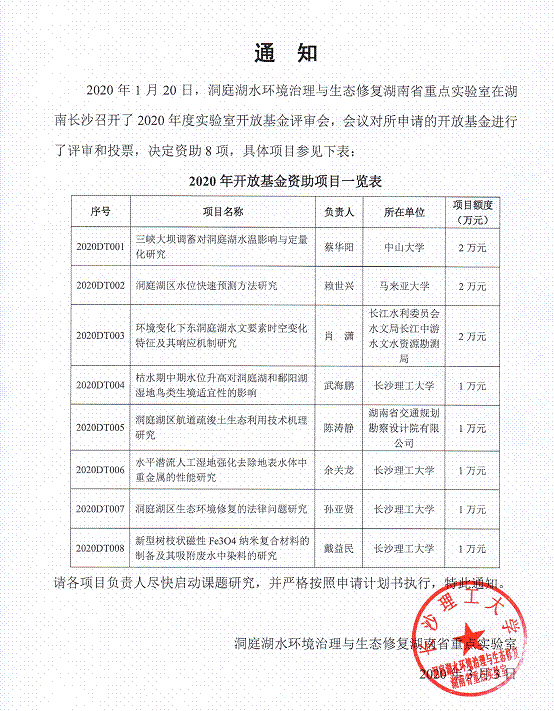附件【2020年洞庭湖水环境治理与生态修复湖南省重点实验室开放基金立项通知.pdf】
