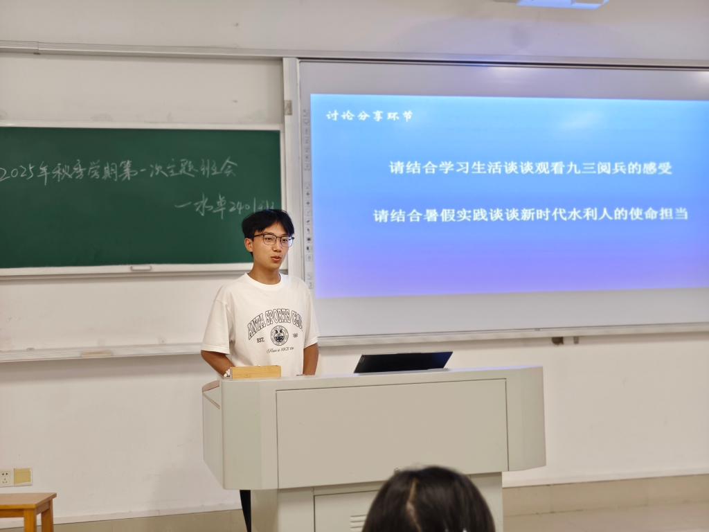 班会以思想教育为引领,各班主任带领学生深入学习习近平总书记在纪念中国人民抗日战争暨世界反法西斯战争胜利80周年大会上的重要讲话精神。同学们结合水利专业特色与暑期社会实践经历,分享观看九三阅兵的感悟体会。班级党员与入党积极分子主动发言,引导全体同学将个人理想融入国家发展大局,立志为中国式现代化建设贡献青春力量。